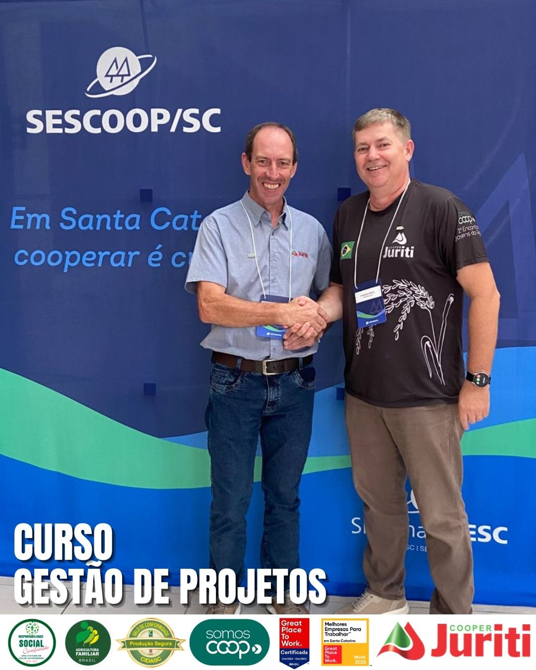 O Diretor Executivo, Sr. Francisco Pawlak, e o Gestor de Operações Industriais, Leomar Eger, participaram do curso de Gestão de Projetos, realizado pelo Sescoop/SC, em Florianópolis, aprimorando habilidades estratégicas e reforçando o compromisso com a excelência na gestão.